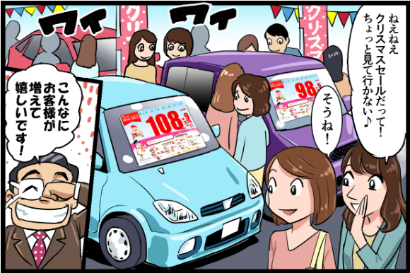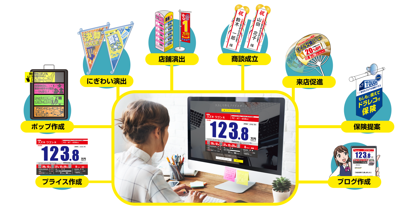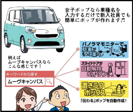 IT業界からモーター業界に飛び込んだ時、最初に目に付いたのは専門用語が並ぶ展示場でした。「ワンオーナー」「現状渡し」「ローダウン」。そして、いまでも展示場には手書きの専門用語が並んでいます。これらの専門用語は女性にまったく伝わりません。そこで若者や女性の心をつかむ店頭演出を実現するために誰でも、簡単に、伝わる売り場を作ることができる集客支援システムを開発しました。当社の強みはIT技術力と心理学の観点を取り入れたモーター業界に特化した開発力です。