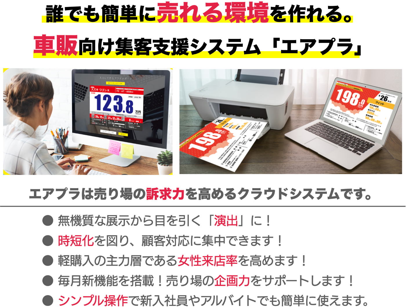 北海道から沖縄まで女性来店率に悩む自動車販売店がエアプラを活用して売り場の変化を実感されています。また、女性視点に基づいた売り場改善とエアプラを活用した業務時短化により人手不足に悩む中小企業にとって「働き方改革」を実現できます。